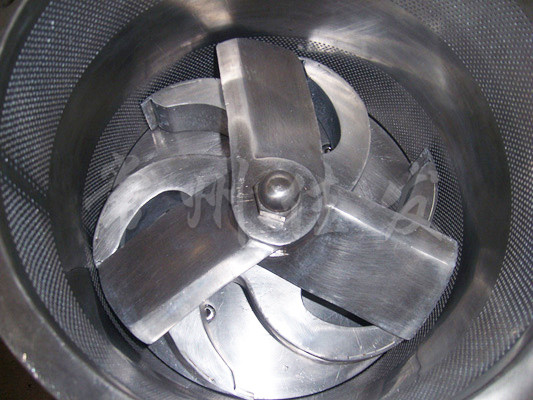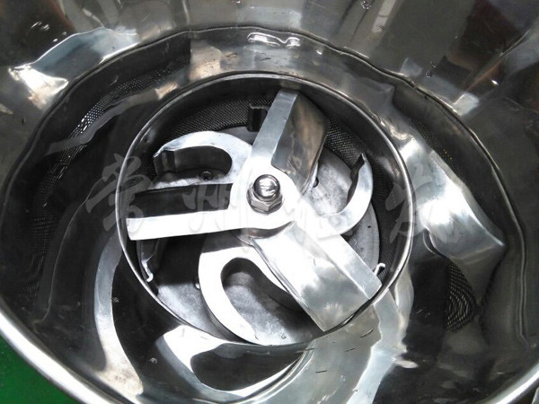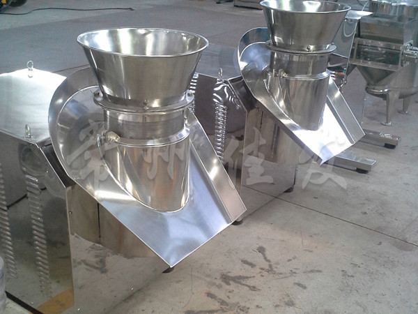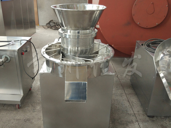 本機是通過一組旋轉碾刀,將前道工序制成的濕材注入環(huán)碾刀的不銹鋼篩筒篩孔中,從而制成圓柱狀的濕顆粒,供下道工序拋丸使用。本設備可通過更換不銹鋼篩筒來取得不同大小的顆粒。