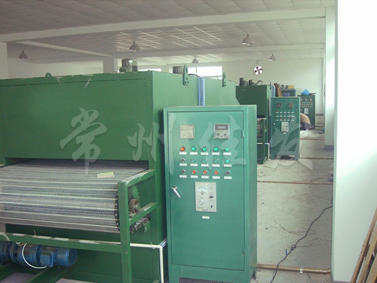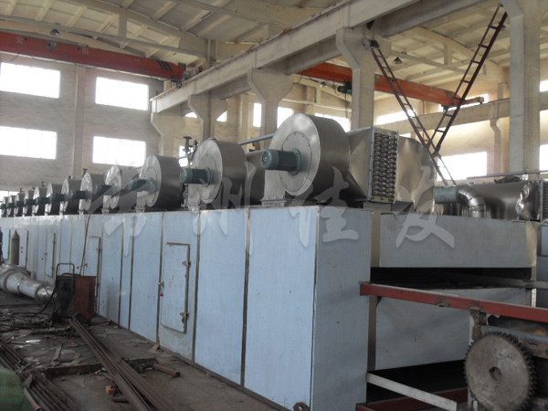 物料由加料器均勻地鋪在網(wǎng)帶上,網(wǎng)帶一般采用12-60目不銹鋼絲網(wǎng),由傳動(dòng)裝置拖動(dòng)在干燥機(jī)內(nèi)移動(dòng)。干燥機(jī)由若干單元組成,每一單元熱風(fēng)獨(dú)立循環(huán),部分尾氣由專門濕風(fēng)機(jī)排出,廢氣由調(diào)節(jié)閥控制,熱氣由下往上或由上往下穿過鋪滿物料的網(wǎng)帶完成熱量與質(zhì)量傳遞的進(jìn)程,帶走物料的水份。網(wǎng)帶緩慢移動(dòng),運(yùn)行速度可根據(jù)物料溫度自動(dòng)調(diào)節(jié),干燥后的成品連續(xù)落入收料器中。上下循環(huán)單元根據(jù)用戶需要可靈活配備,單元數(shù)量亦可根據(jù)需要選取。