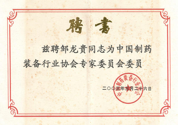 制藥裝備協(xié)會(huì)專家委員聘書
